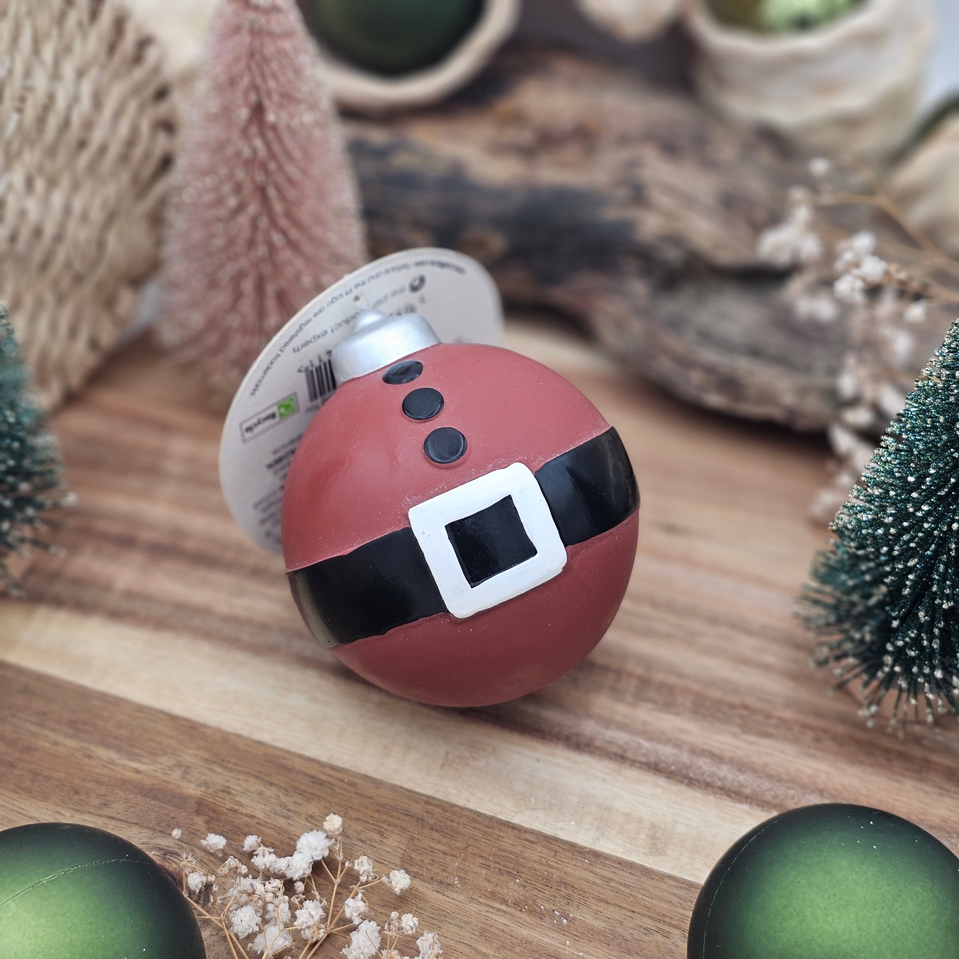 Latex Christmas Bauble Dog Toy with a cute smiley face and a built in squeaker. Perfect for playful dogs. Great for the game of fetch and encouraging your pet's interactive playing and training. Cute, strong and durable.