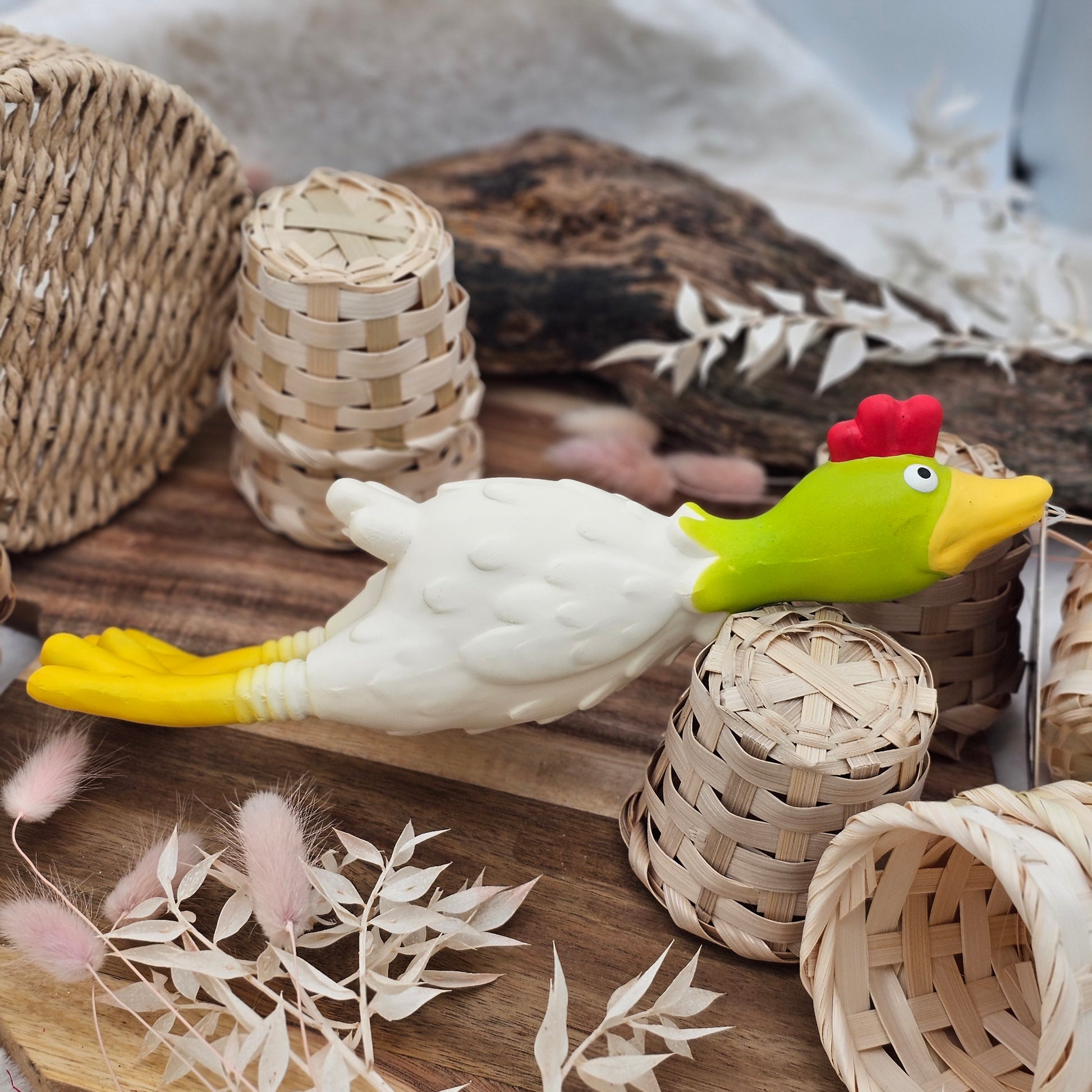 Latex Chicken Dog Toy with a cute smiley face and a built in squeaker. Perfect for playful dogs. Great for the game of fetch and encouraging your pet's interactive playing and training. Cute, strong and durable.