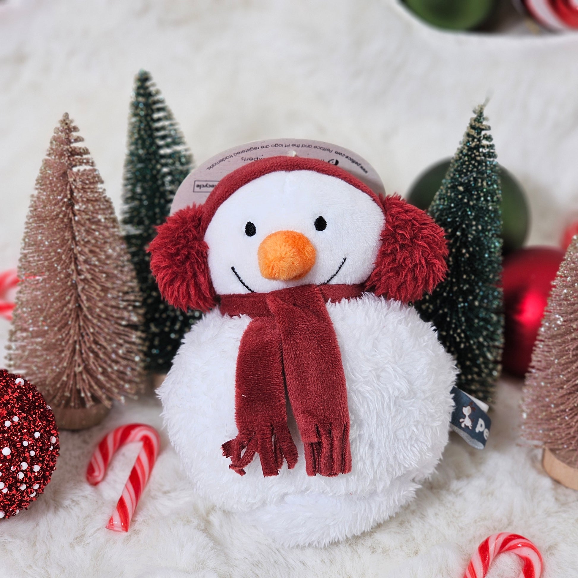 The Snowman Plush Christmas Dog Toy. Made from super soft fleece with embroidered eyes and mouth. Wearing adorable ear muffs and a fleece scalf. Soft, cuddly and super cute. Great for playing fetch and encouraging exercise or could be your best friends new favourite snuggle buddy. Includes a built in squeaker, perfect for playful dogs. Not suitable for strong chewers