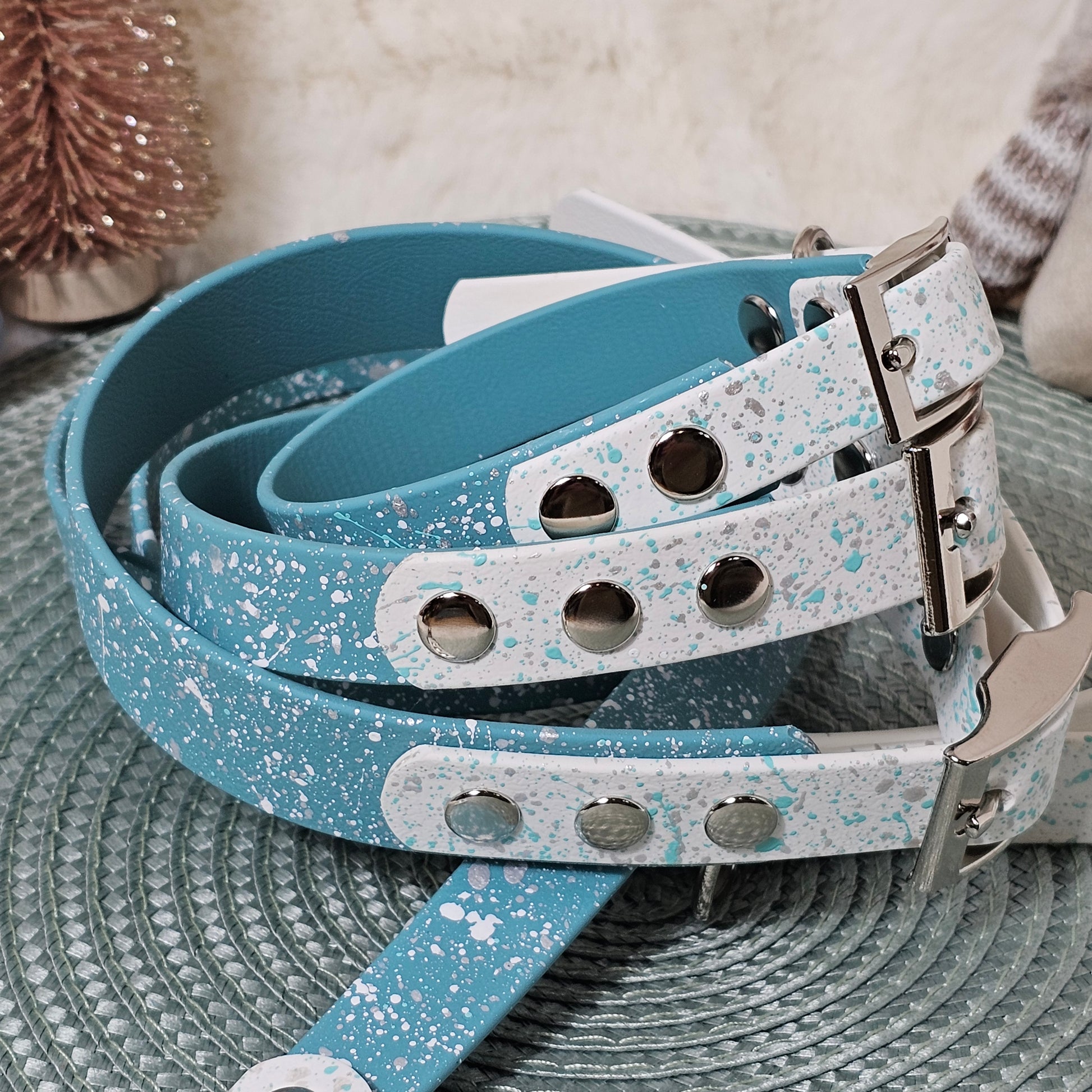 Step into a frosty fairytale with our Nordic Sparkle Dog Collar - a stunning blend of soft pastel turquoise and crisp white, hand-splattered with metallic silver and icy tones for a beautiful Nordic-inspired finish.