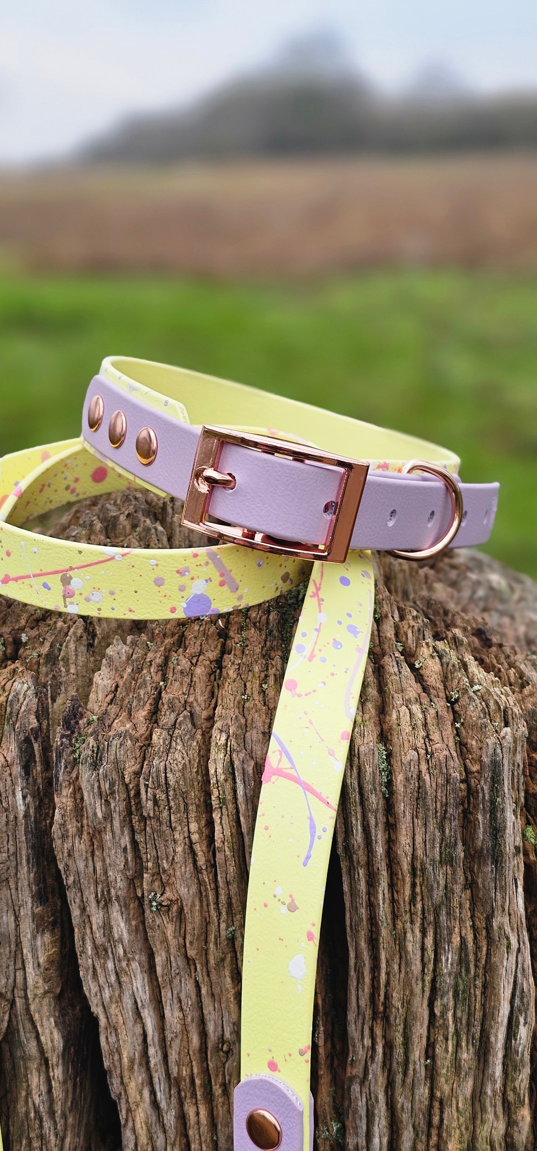 Designed to add a hint of gentle colour without compromising on strength, this collar blends elegance with practicality for dogs who love to explore in style. The Lemon and Lilac BioThane® straps, are finished with soft pastel splatters and create a cute yet elegant look - ideal for dogs who love to look the part.